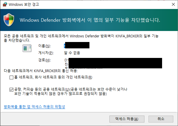 실행시키려는 프로세스가 Listen 등을 수행하는 프로세스 일경우, 아래와 같이 팝업이 뜨게 되고,