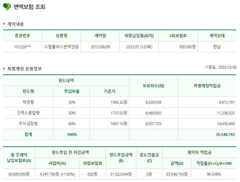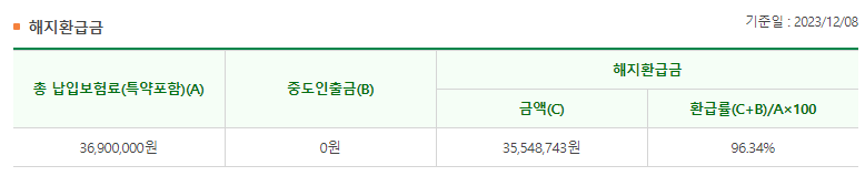 계약자 적립금 35,122,470원 → 35,548,743원 (환급률 95.96% → 96.34%)