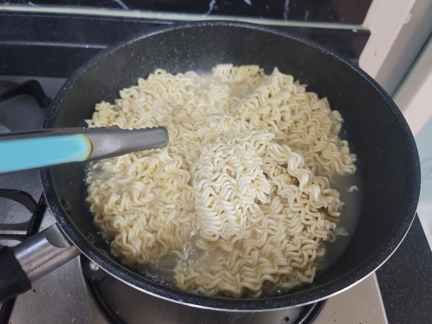 면 3개 투척하고.. 면수 안빼고 한방에 만들기 위해..
