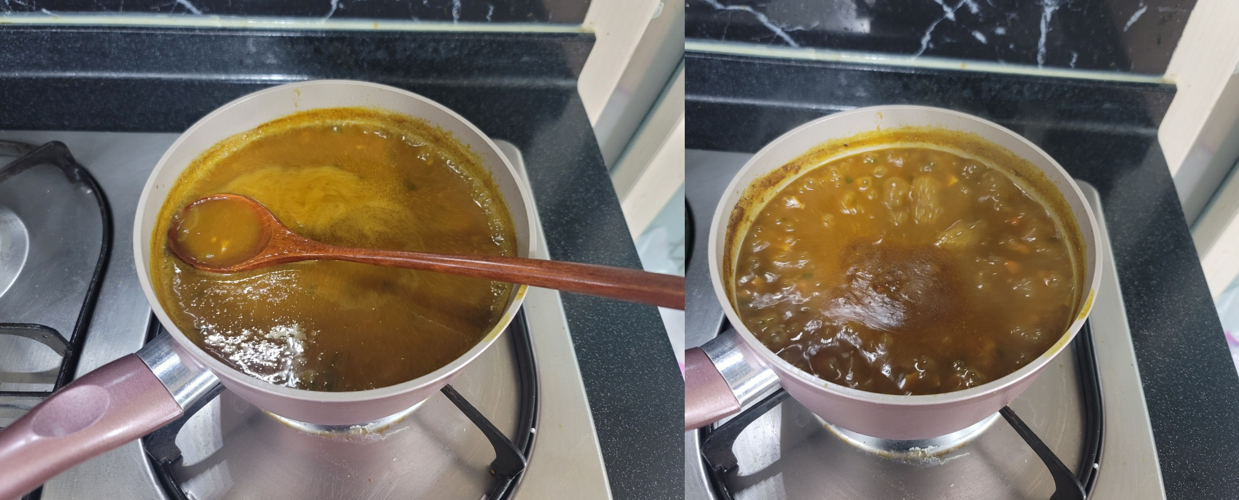 퐁드보 육수넣고 물 넣고 끓다가 카레를 붓습니다.