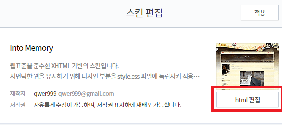 스킨편집 들어가면... 멀쩡한 화면 편집하는게 나오는데.. 우측상단에 아래 html 편집이 보인다.
