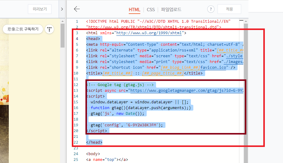 여기에 4라인부터 <head> 이다. </head> 안에다가 복붙!!