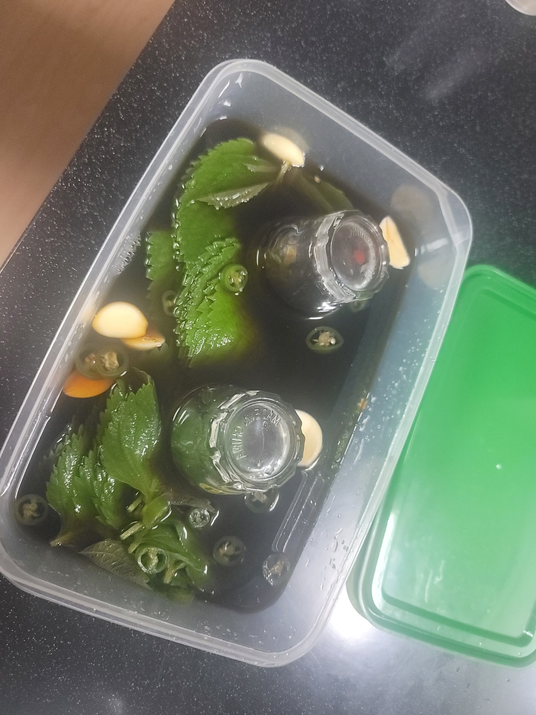 깻잎 장아찌를 해놨는데... 지금은 확실히 색깔이!! 파랗지 않음..