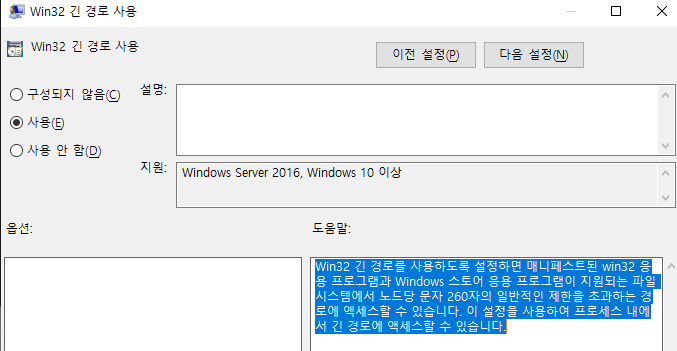 Win32 긴 경로 사용 항목이 있음. 그것을 활성화해서 사용으로 바꿈