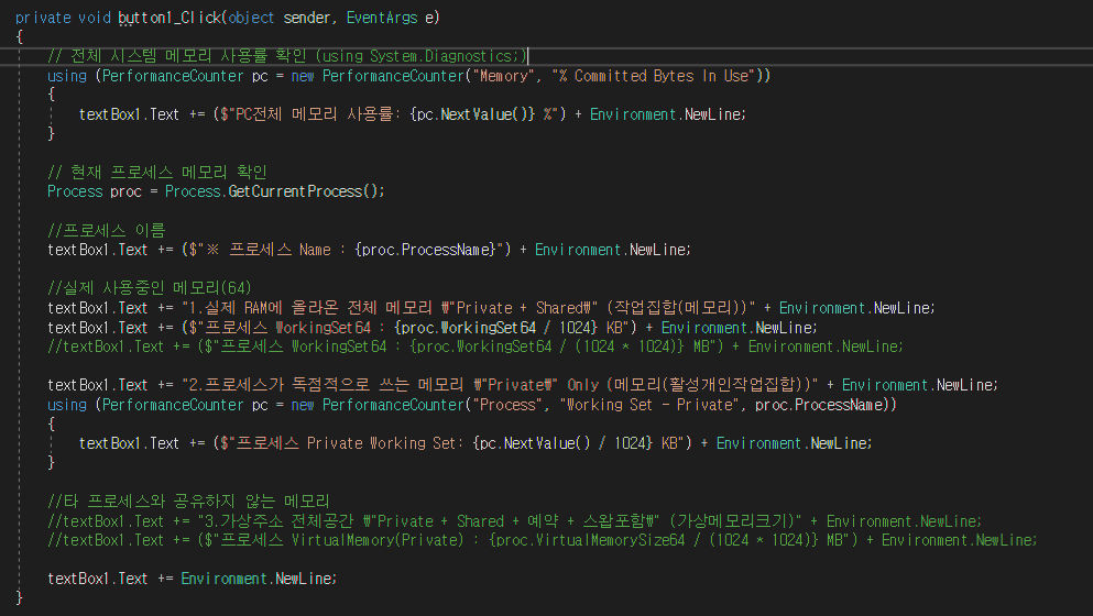 //textBox1.Text += ($"프로세스 VirtualMemory(Private) : {proc.VirtualMemorySize64 / (1024 * 1024)} MB") + Environment.NewLine;